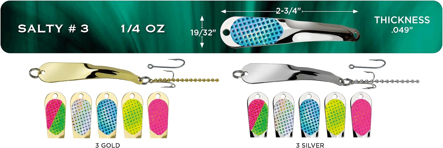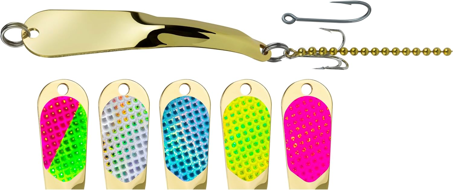 The Steely Fishing Lure Spoon by Iron Decoy is designed for versatile use in casting, trolling, jigging, and ice fishing. Ideal for freshwater and saltwater environments, it's crafted to attract a variety of fish including trout, bass, salmon, lake trout, crappie, perch, walleye, and northern pike in lakes, rivers, and streams. The patented ball chain lure stands out with its unique action and impressive performance. All Iron Decoy lures are designed with the same hydrodynamic principles, ensuring consistent action across all 5 sizes.