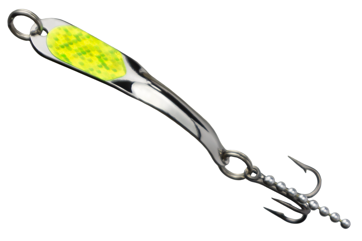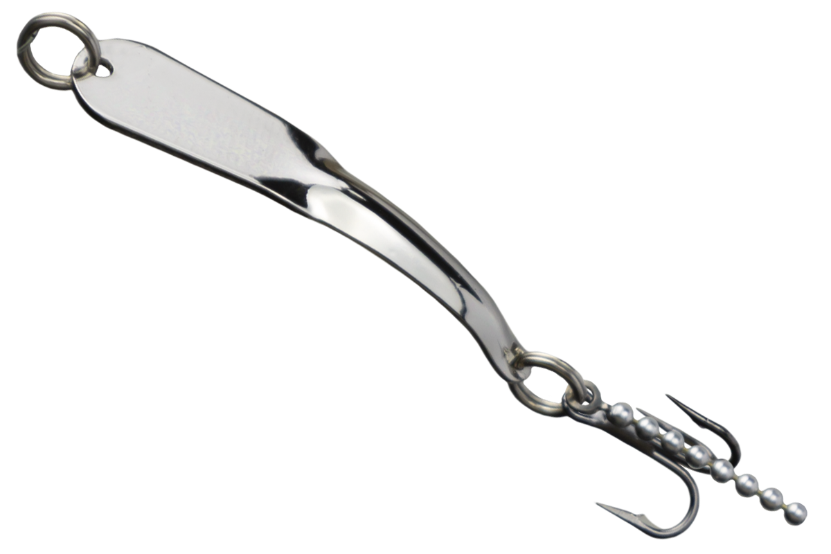 The Steely Fishing Lure Spoon by Iron Decoy is designed for versatile use in casting, trolling, jigging, and ice fishing. Ideal for freshwater and saltwater environments, it's crafted to attract a variety of fish including trout, bass, salmon, lake trout, crappie, perch, walleye, and northern pike in lakes, rivers, and streams. The patented ball chain lure stands out with its unique action and impressive performance. All Iron Decoy lures are designed with the same hydrodynamic principles, ensuring consistent action across all 5 sizes.