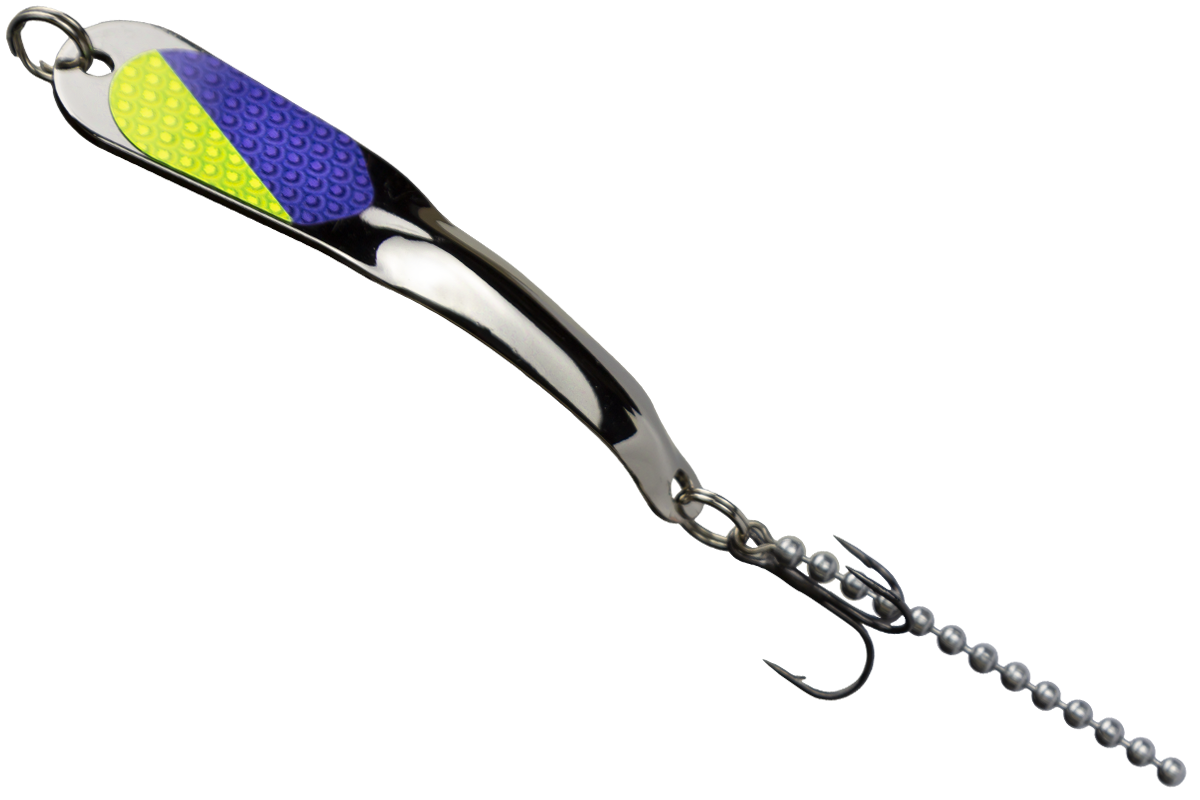 The Steely Fishing Lure Spoon by Iron Decoy is designed for versatile use in casting, trolling, jigging, and ice fishing. Ideal for freshwater and saltwater environments, it's crafted to attract a variety of fish including trout, bass, salmon, lake trout, crappie, perch, walleye, and northern pike in lakes, rivers, and streams. The patented ball chain lure stands out with its unique action and impressive performance. All Iron Decoy lures are designed with the same hydrodynamic principles, ensuring consistent action across all 5 sizes.